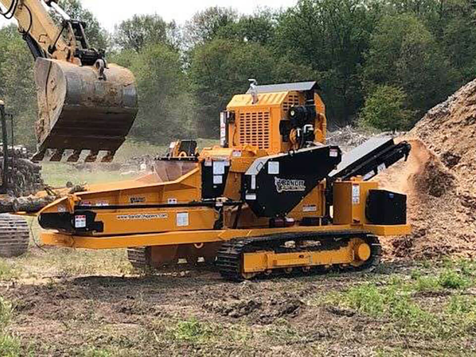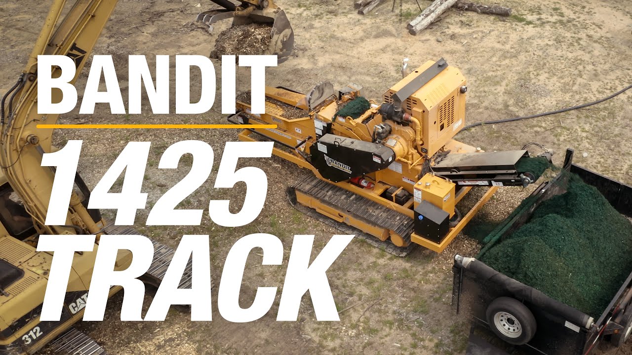 Due to the popularity of the tow-behind model, a track version of the 1425 was developed. The track undercarriage increases versatility, allowing it to easily be maneuvered and positioned. All track and grinding functions are controlled by a wireless radio remote control. A Caterpillar 308 steel track undercarriage offers a stable grinding platform for a variety of terrain. The 1425 track is rated as a 14 capacity machine and features a 20 high x 25 wide mill opening. A Caterpillar 174 horsepower Tier 4 engine provides added torque and power compared to the 1425 towable. The infeed is 24” wide x 7’ long and is configured with a rubber or steel conveyor. The 1425 has Bandit’s cuttermill that is 36” diameter and equipped with 14 teeth. A stationary discharge system with a stacking height of 7' is standard and a magnetic head pulley is available to separate nails for those grinding pallets.