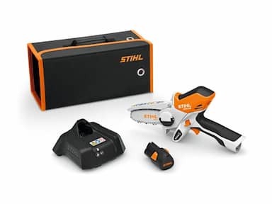 The STIHL GTA 26 battery-powered cordless garden pruner is the first of its kind on the U.S. market. With its lightweight and compact design, the GTA 26 garden pruner is ideal for a range of gardening tasks. The four-inch guide bar allows for precise cutting and pruning, and its size makes it possible to get to those hard-to-reach spots. Its rubber grips provide ease of use and minimize wrist torsion. This pruner is also easy to maintain with toolless replacement of the removable bar and chain. This saw chain gives you the ability to make smooth and precise cuts with a lower kickback tendency. An LED light display provides charge level and status of the tool. With a battery, charger, multi-oil, and even a transport bag included, the GTA 26 garden pruner set comes with everything you need to take on a variety of landscaping tasks.